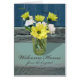 Bienvenue à la maison de l'hôpital, arrangement de fleurs. La carte de voeux en papier présente un tableau numérique de marguerites jaunes et oeillets blancs disposés dans un bocal en verre et assis sur un pas en ciment. Une porte bleue en bois se remplit dans l'arrière - plan supérieur. Copyright © Shoaff Ballanger Studios.