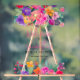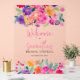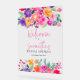 Un panneau de bienvenue à la réception de mariage aquarelle florale lumineuse de jardin rose vif avec des fleurs peintes à la main roses, rouges, violettes, orange et de la verdure feuilles d'eucalyptus et feuillage vert avec une police moderne de pinceau script sur acrylique clair transparent.