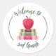 Un autocollant rond blanc avec une pile de livres et une pomme rouge sur le dessus pour accueillir vos jeunes élèves le premier jour de l'école. Personnalisez le texte avec votre niveau de note en utilisant le modèle fourni. Ce design est également disponible en noir. © ArianeC Illustrations-Tous droits réservés