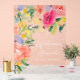 Signe de bienvenue transparent pour une fête prénuptiale bohème florale lumineuse et audacieuse, avec des roses pêche peintes à la main, des fleurs rouges aquarelle, de l'eucalyptus vert et de la verdure ainsi que d'autres jolies fleurs de jardin mignonnes avec une police de caractères moderne. Une explosion de couleurs audacieuses et de jolies floraisons !
