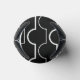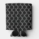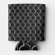 This can cooler has an art deco design of white half circles connect with lines on a field of black.