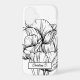 This phone case features an oversized line art drawing of tulips in black on a white background with and a personalized name. Original art from Dogwood & Thistle.