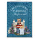 Deep blue art noveau background with a bear boy and a little bear crawling at his feet, in front of a garden gate with pretty flowers. A whimsical design perfect to congratulate a new big brother on the birth of his little sister. Customize it by changing the verse and/or add your personal message.