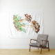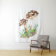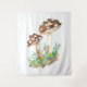 traditional watercolor artwork of two big brown coloured mushrooms growing from a green and brown coloured forest floor on tapestry.