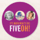 50th birthday party paper coasters. Great to add a personal touch to a surprise birthday party. Personalize with three of your favourite birthday girls photos and with your choice of name. Currently reads It's Katherine's big fiveoh!. Graphic design by Sarah Trett for www.mylittleeden.com