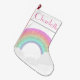 This whimsical and magical Christmas stocking features an image of a large faux glitter rainbow. The rainbow features a pattern of pastel colours in a glitter design. The child's name is printed above the picture in a pink, sophisticated font. You can personalize this stocking and replace the sample name with your own child's name.