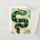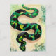 traditional watercolor artwork of a big green and black coloured snake on a postcard.