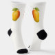 Big mango on your socks. Along with your name, text, or slogan in red serif font below it. Sweet juicy fruit on almost white background.
