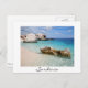Postcard of the big rocks in the Mediterranean Sea at the sand beach of Cala Mariolu, situated near Cala Luna in the Gulf of Orosei on the island of Sardinia, Italy with Sardinia in black on a white background with the text: 'Sardinia'.