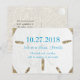 Big, white sand dollar wedding announcement postcard. Sparkling water at the shore background shows through the holes in a realistic sand dollar image. Customize three lines of blue text on the front, and add more information to the back for a tropical, beach destination wedding event.
