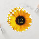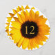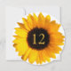 Chic table number card done in a round shape, with graphics of a big yellow sunflower covering the card, with the yellow number in the centre. Personalize one card for each table at your reception. Use a clear plastic florist card pick, to attach to your table centre pieces.