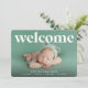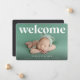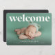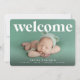 Un design faire-part de naissance doux et élégant avec un fond de saignement plein horizontale ou une photo orientée paysage avec "bienvenue" superposé en haut en blanc bloc de lettrage rétro. Le nom et les statistiques de naissance de votre bébé apparaissent en bas. Ajoutez trois photos de carré supplémentaires à l'arrière, ainsi qu'un message personnel.