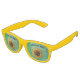 These retro party glasses are green with big yellow sunflowers with fancy petals and brown centers. Customise your text with the template.