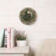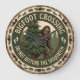 This distinctive round wall clock features a vintage-inspired design perfect for cabin decor, man caves, or outdoor enthusiasts. The central illustration depicts a legendary Bigfoot peering from behind a large evergreen tree. Encircling the artwork are bold, weathered slogans reading "BIGFOOT CROSSING" and "DO NOT DISTURB THE SASQUATCH." The perimeter of the clock face is decorated with a rustic border of pinecones, oak leaves, and mysterious footprints, set against a distressed parchment background. The earthy green and brown color palette enhances the rugged, forest-themed aesthetic. This functional piece of home decor is a fantastic gift for fans of cryptozoology, hikers, and those who appreciate unique wilderness art. Its aged, metallic-look finish provides a striking and conversational focal point for any interior wall.