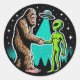 This whimsical image illustrates a friendly encounter between two legendary beings: Bigfoot and an alien. The scene, set against a starry night sky with silhouettes of pine trees, shows Bigfoot and the alien shaking hands under the beam of a UFO hovering above. Bigfoot, covered in brown fur, stands on the left while the green, humanoid alien with a large head and black eyes stands on the right. The combination of these iconic figures in a peaceful meeting adds a playful twist to both myths, making it a fascinating and humourous piece for enthusiasts of the unexplained.