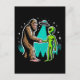This whimsical image illustrates a friendly encounter between two legendary beings: Bigfoot and an alien. The scene, set against a starry night sky with silhouettes of pine trees, shows Bigfoot and the alien shaking hands under the beam of a UFO hovering above. Bigfoot, covered in brown fur, stands on the left while the green, humanoid alien with a large head and black eyes stands on the right. The combination of these iconic figures in a peaceful meeting adds a playful twist to both myths, making it a fascinating and humourous piece for enthusiasts of the unexplained.