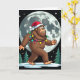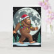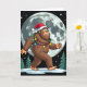 Brighten someone’s holiday with a charming Christmas greeting card featuring a lovable cartoon Bigfoot adorned in a festive red Santa hat 🎅🏼. This adorable creature is walking in front of a giant grey moon wrapped in twinkling multicolored Christmas lights 🌕🎄. With its brown fur, bare feet, and joyful expression, this Bigfoot is sure to bring a smile to anyone's face. The card's text is whimsically placed against the black background with silhouettes of evergreen trees at the bottom. Spread some holiday cheer with this perfect card that captures the magic of the season! 🎁