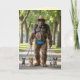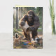 A cute dog greeting card featuring Bigfoot walking small dogs in a rural setting.