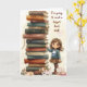 Girl stands next to a tall stack of books. She is surrounded by cozy little animals. The words say "I'm going to need a bigger bookshelf." The card is blank inside.