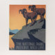 Two bighorn sheep on a steep crag overlooking a canyon. Sunset colours in background. Vintage poster has strong visual impact.