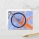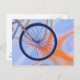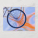 Colourful postcard with my artwork of a bicycle wheel on a blue and orange wavy abstract background.