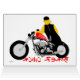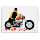 BIKER CHICK wearing all black and adorned with metal chains, dark shades and, of course, leaning against her motorcycle. For apparel, the BIKER CHICK is facing forward on the front and facing backwards on the back.