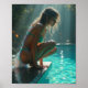 A surreal water nymph crouches at the edge of a shimmering, iridescent pool, surrounded by dynamic tendrils in a dreamlike, vibrant scene.