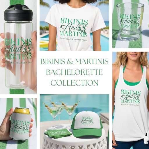 Bring the beachy vibes with this playful “Bikinis and Martinis” design—featuring bold, stylish text in a vibrant green palette, accented with martini glasses and a sweet ribbon bow. It’s the perfect match for sun-soaked bachelorette getaways, poolside celebrations, or any bride squad ready to sip in style.