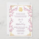 This traditional Chinese wedding invitation features a golden Asian frame, pink cherry blossoms and a golden artistic double happiness symbol on a white background. With a traditional Chinese text, and red cherry blossoms on the backside.