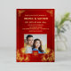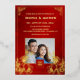 This elegant Chinese wedding invitation features a photo, a gold foil Chinese frame and round gold double happiness symbol and gold foil flowers on a floral ruby red shimmering background. With a traditional Chinese text at the backside. Chinese wedding invitation or tea ceremony invitation.