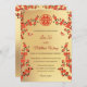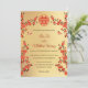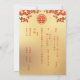 Red cherry blossom branches and two butterflies on a gold background. Traditional Chinese wedding invitation with a red double happiness symbol. With a traditional Chinese text template at the backside.
