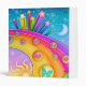 A bright and colourful sixties style retro pop art of a sky from morning until night with stars, moon, sun and a rainbow.