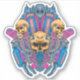 This intricate, cyberpunk-inspired design showcases a chilling fusion of skulls and mechanical elements. A central skull, adorned with a mask-like apparatus and connected by tubes and wires, dominates the composition. Flanking the central skull are two additional skulls, each integrated into a complex network of pipes and gears. The overall aesthetic is dark, futuristic, and visually striking, with a dominant colour palette of blue, pink, and grey. The design evokes a sense of both danger and technological advancement, suggesting a dystopian world where organic and mechanical elements have become inextricably intertwined.