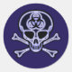 Skull and crossbones with biohazard symbol. Art sticker in purple and black.