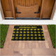 Black doormat with a repeating biohazard symbol pattern and customizable text bar in bright yellow.