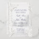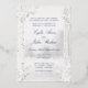 A soft white and silver foil birch tree forest wedding invitation featuring a foggy forest woodland background with pure white birch trees in the foreground adorned with white peonies and silver dollar eucalyptus greenery. Bride and Groom's parents invite the guests with your names in a classic modernized wedding script in silver foil. The back of the invite looks more like the cover and features the Bride and Groom's first name and surnames in a silver grey font. The back is not silver foil.
