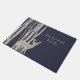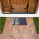 Inviting door mat done in dark slate blue, with graphics of a semi transparent birch trees and deer. Tan custom text can be personalized, to read what you want.