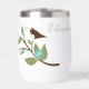 Bird birthday collection featuring a brown bird on a tree branch amidst leaves and bright blue flowers