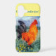 For chicken fans with a Cockerel strutting across the grass and customizable text. This colorful farm bird is from my original rooster glass painting. Copyright Annabel Potter