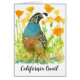 A greeting card decorated with a California Quail bird with colourful feathers standing in a patch of bright orange poppy flowers inspired by the state bird and state flower of California drawn with ink and painted with watercolor.
