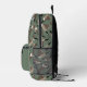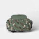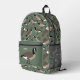 Add initials or a name to create a personalized backpack. It's perfect for bird lovers with its pattern of Canada geese in brown, black and white against a dark sage green background.