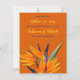 Modern photo save the date cards in orange with bird of paradise flowers design. Simple text with names, date and location of wedding on the front with four photo templates on the back. Also add your wedding website QR code to direct wedding guests to your website for more information. This is a smaller 4x6 size card and changing the size will alter the photo placements and design. This design is also downloadable to share online.