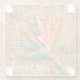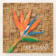 Personalized glass coasters feature your last name and an exotic tropical bird of paradise watercolor flower on a woven wicker background. MATCHING items in our store.