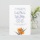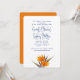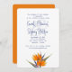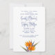 Bird of paradise wedding invitations with exotic, orange flowers design. Dark blue text using modern fonts printed on white, vertical paper. A large "and sign" holds the names. Customize to include a wedding website, reply online, or add reception info. This design also comes as an instant download.