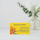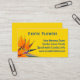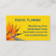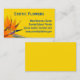 Bright, floral business cards with bird-of-paradise flowers. Yellow cards with exotic, orange flowers in the corner. Customize dark blue text in two places to advertise a business or profession. Title or business name at top with up-to five lines of printed text which is aligned to the right. Reverse is solid yellow.