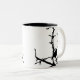 This contemporary fine art mug features a black and white silhouette modern abstract pattern of a Dark-eyed Junco (Junco hyemalis) perched on a bare branch high in a tree. This bird is actually a kind of small, grey and white sparrow. The design is repeated on the right and left sides.