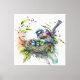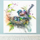 Colourful detailed watercolor bird print, baby birds in nest with parent. Vibrant colours.