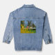 This women's jean jacket displays a row of colourful birdhouses basking in the spring sunshine. A yellow forsythia bush, trees, blue sky, and green grass frame the row of unique birdhouses. Show your love for feathered friends and their birdhouses.