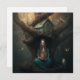 A dreamlike image a woman holding a bird's nest in a box while sitting in a hollow tree and song birds fly and sit around her. The roots of the tree form a partial bird's nest for her to sit in. There is a fantasy birdhouse in the tree with an elaborately carved door above her head. This is a collaboration between me and AI software combined with Photoshop and digital painting done by me.
