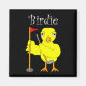 Birdie in curly text with a yellow chick holding a golf club and the flag in a golf hole is a funny gift design for golfers.